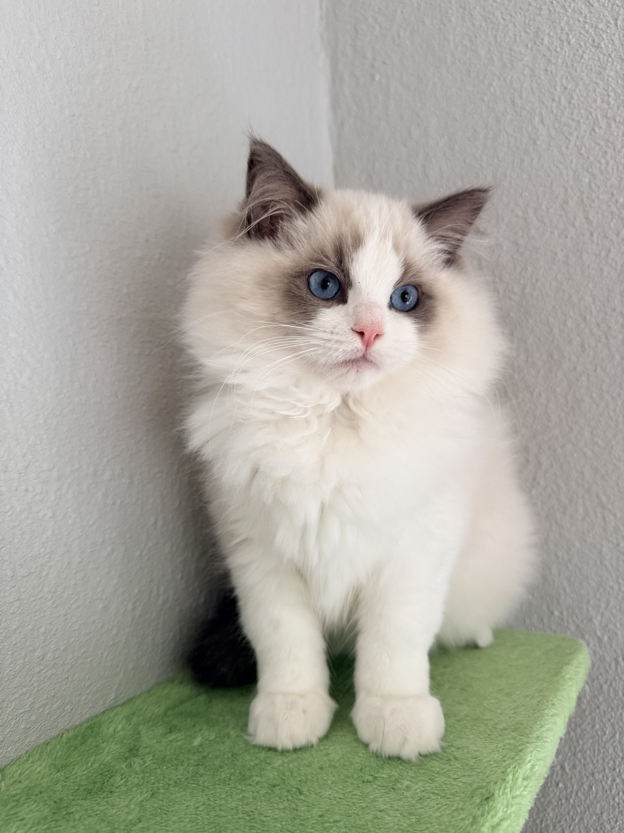 Mom and Dad are both award winning Ragdolls in TICA and this guy could be too! August is a large boy who loves to be pet! His favorite activities are playing with his siblings and having a soccer match with the spring toy. This guys deep blue eyes will melt your heart. I think his personality will be pretty laid back and easy going.
