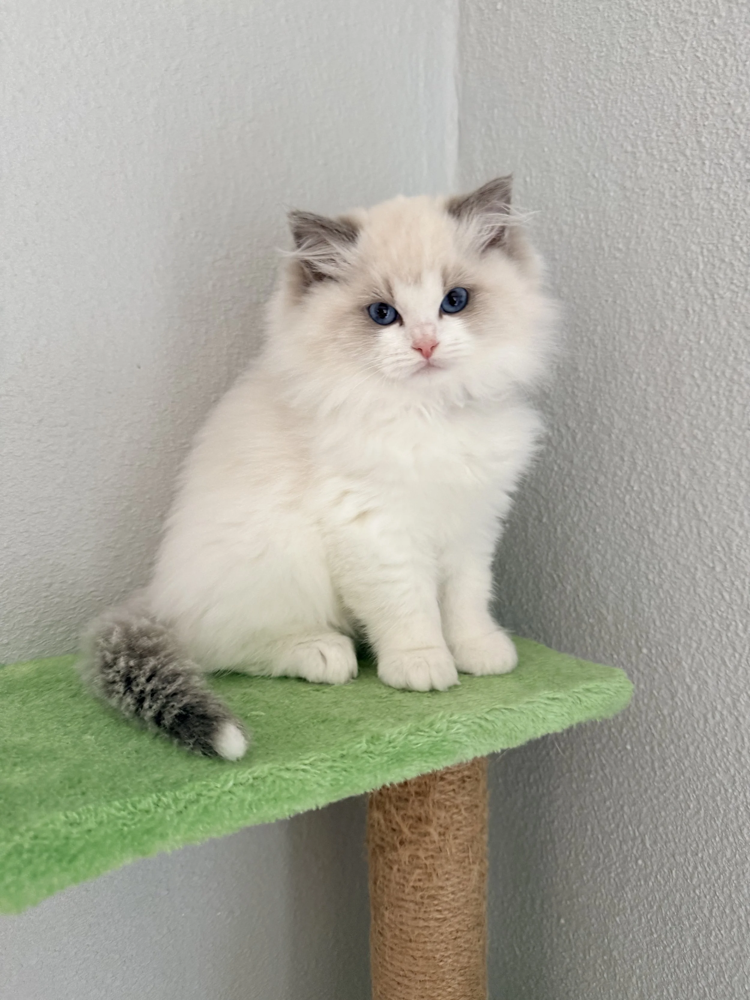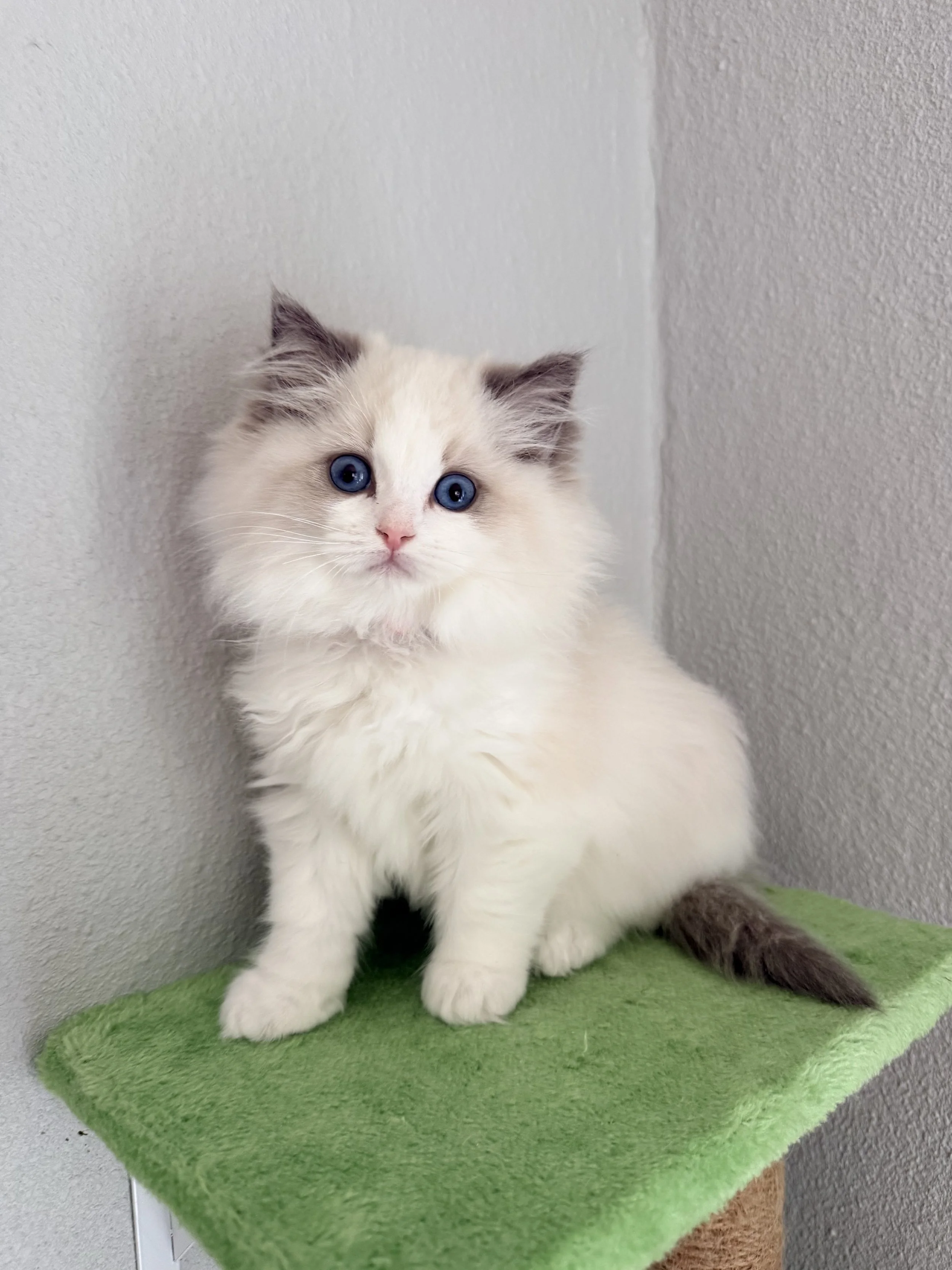 One thing to note is he has an adorable very slight tail kink at the end of his tail. It won't affect his health in any way. It just makes him a very cute pet quality kitten.