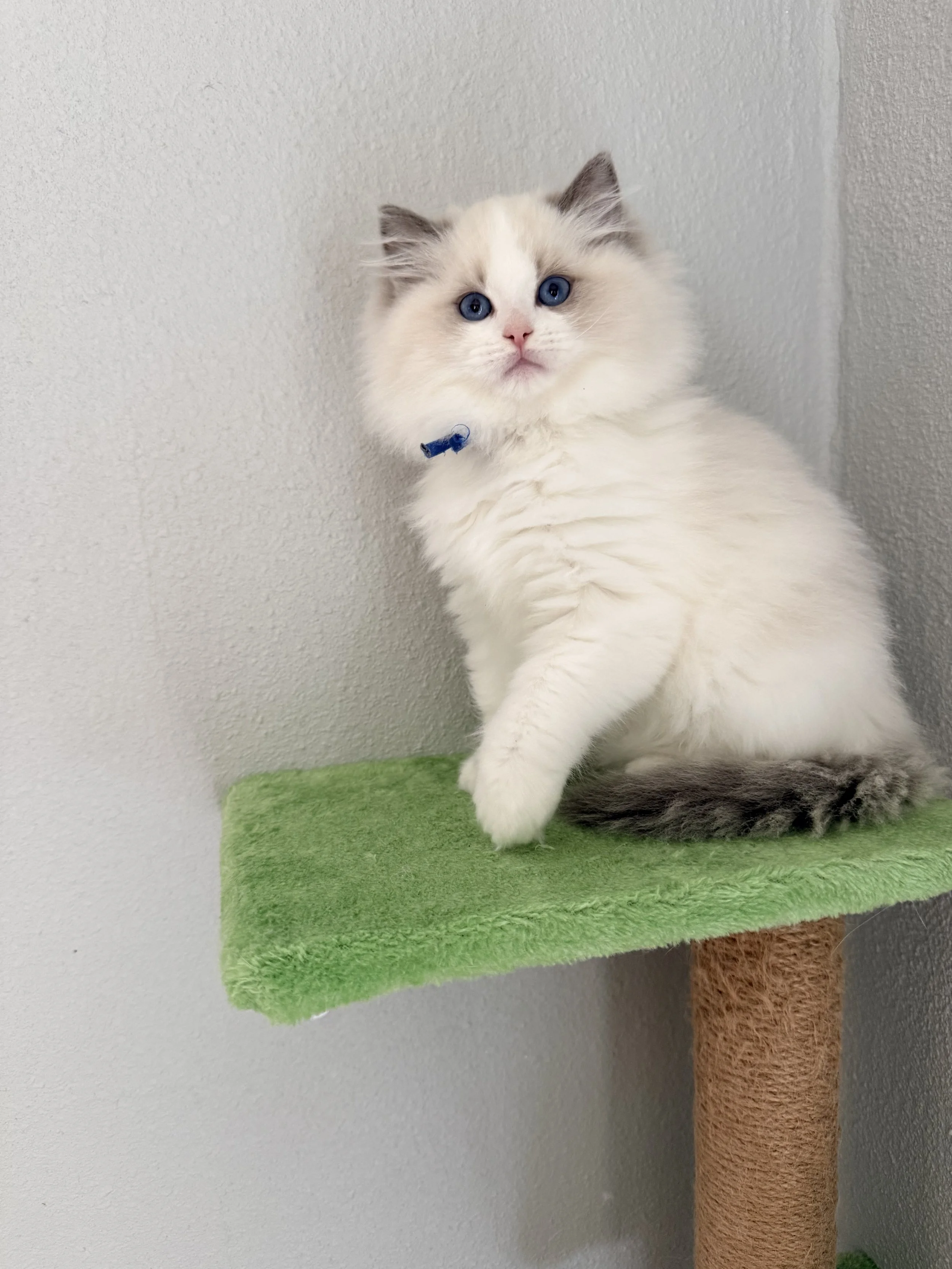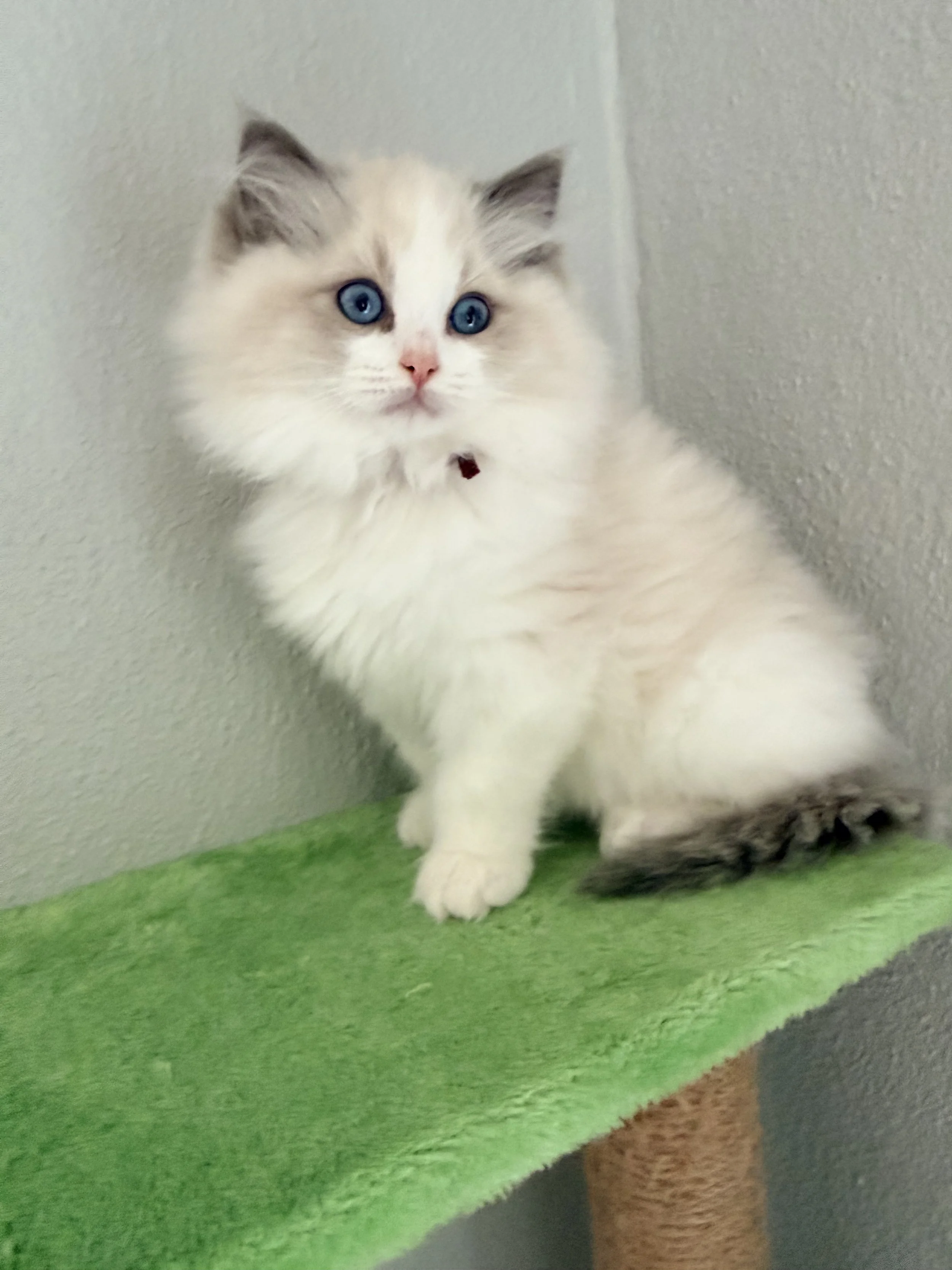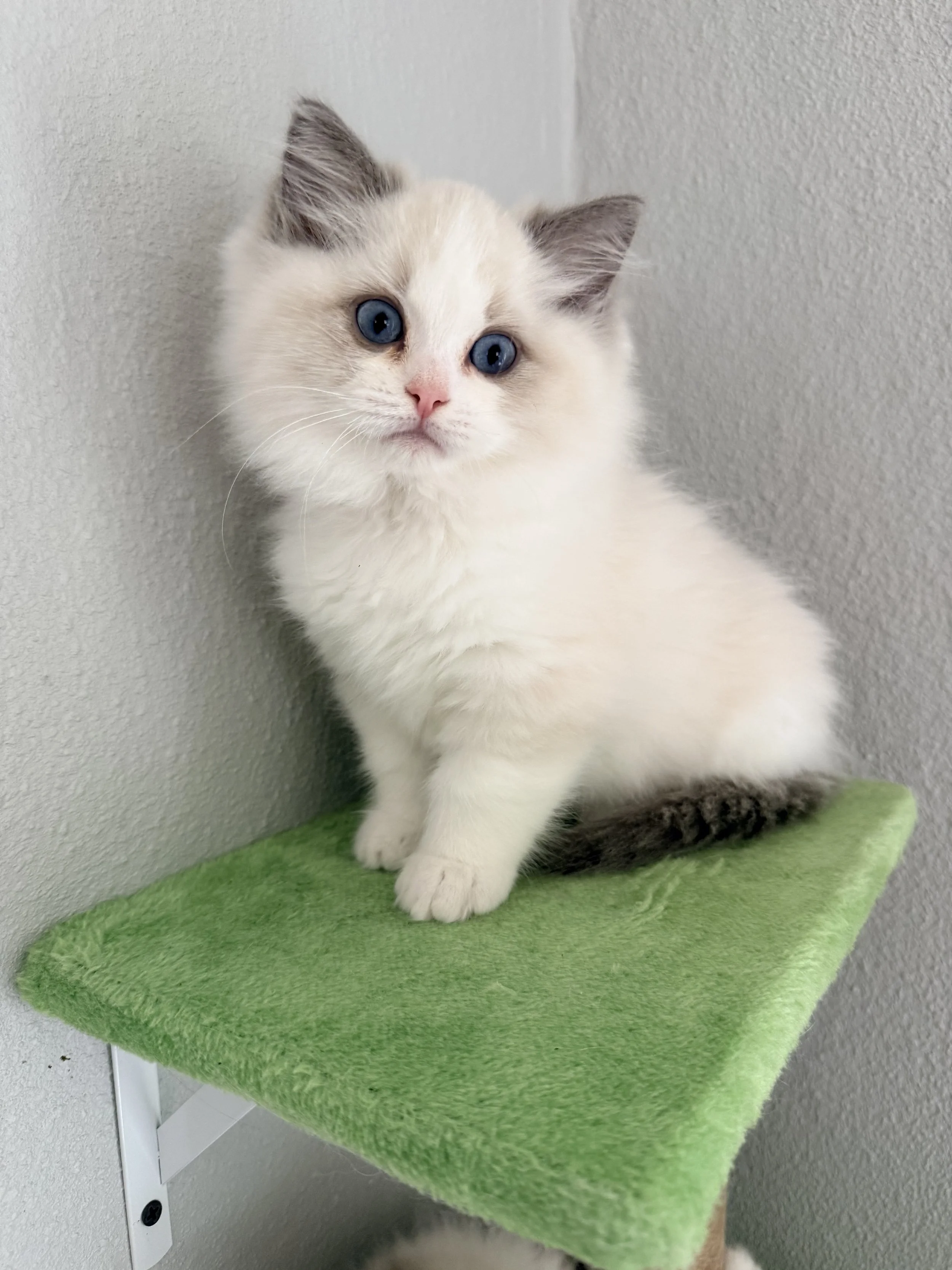 Mom and Dad are both award winning Ragdolls in TICA! Poet is the sweetest most laid back little guy! He has a ton of purr purrs and loooves belly rubs! His favorite toy is a spring which he shares with his siblings.